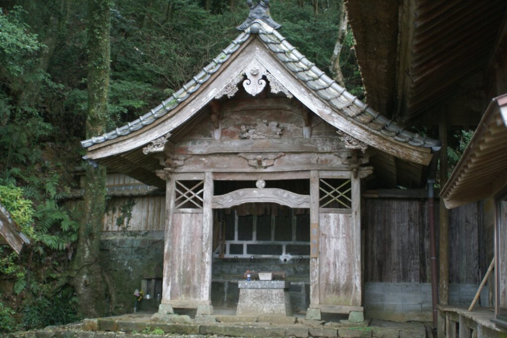 このお堂は戦前まで佐賀市内の谷口鉄工所の菩提所(仏壇)としてお参りされていました。戦後維持管理が難しくなり、水堂へ寄進されました。彫刻は寺院のお堂とは違い、細かい細工が施されています。すべて、台湾檜の木材を使用されています。 中へ入る